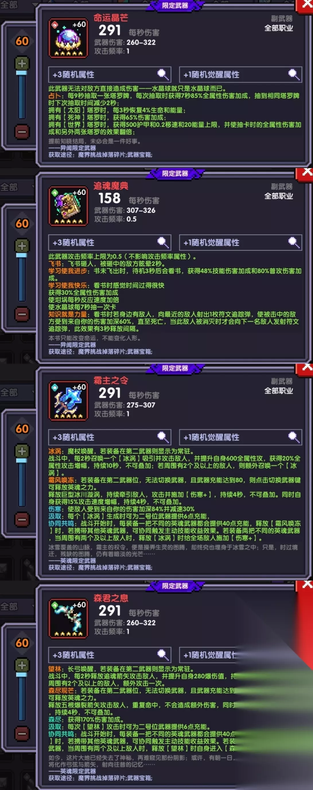 8、新水魔女武器做出来后,就可以开始考虑做限定武器了,第一把限定武器我推荐做异闻武器-水晶球,然后再做异闻武器-魔法书,前期这两把武器属于全场景通用,后期还能当做竞技场专精来使用。有人会问我为什么不做奇趣系列的,这里有3个考虑因素,1、奇趣系列只能对王,对群环境极其不利;2、估计下个月就会出新的限定武器,按照轮替应该是替换奇趣系列对王的,现在做奇趣了,下个月估计就废了;3、异闻武器虽然前期可能没有奇趣对王这么极致,但是伤害也不会很低,而且全场景通用,没有很明显的短板。 ※这里插一句,如果前面只做了水晶球武器,就能通关前面副本(包括小秘境、深渊狩猎、资源副本最高层),那么魔法书可以直接跳过,然后做英魂武器木弓和水杖或者对王限定(新一轮即下一个月的新限定)。 9、限定武器先做哪几把?(图8) 这个还是要看当期大秘境是首领关卡还是群怪关卡,以现在这期群怪为例,前期限定武器我推荐按这个顺序来做: ①异闻-水晶球 → ②异闻-魔法书 → ③英魂-木弓 → ④英魂-水杖 → 暂停不做 如果当期大秘境是首领关卡呢? 这个由于下个月就出对王新限定了,所以下月新区建号的小伙伴肯定的首推新限定的,那么做的顺序就是: ①新限定(6月份出) → ②英魂-木弓 → ③英魂-水杖 → 暂停不做