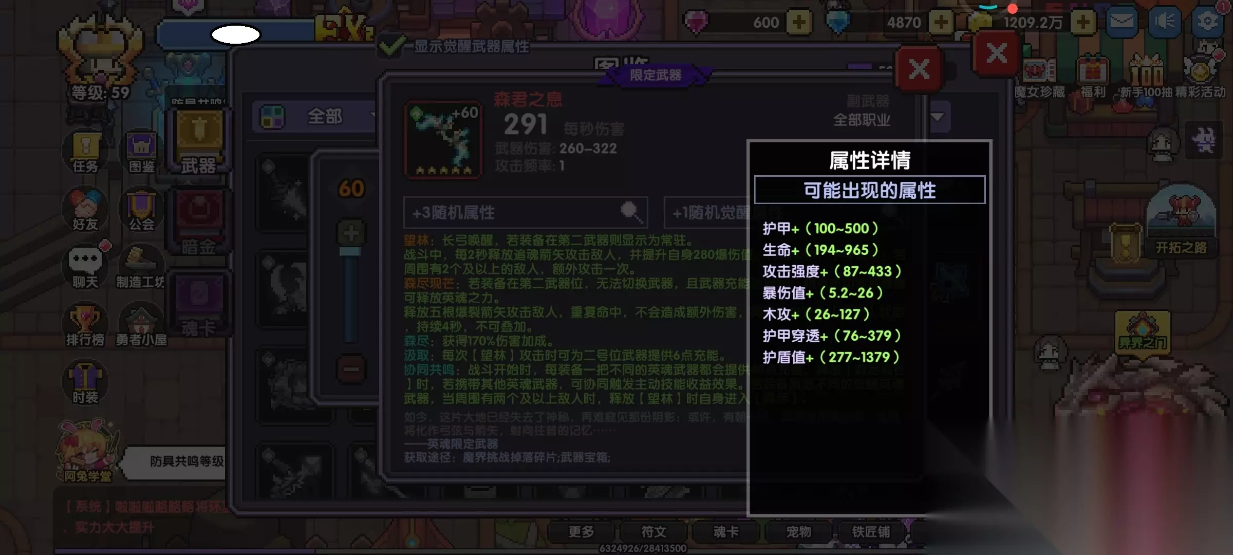 5、武器洗练方面,前期三把过渡武器都不用去洗,如果紫、橙武器有多的碎片可以稍微洗一下(如果洗武器的艾泽红色有多的话),没有就别洗了都留着洗后面的毕业武器。 6、武器升级主要用到血源矿、武器,他们的获取地方如下:(位置太多,我就不一一上图了,大家在游戏里多找找吧) 血源矿的获取地方: 商店:商店-所有礼包、商城-月卡基金、竞技场商店、日常玩法-深渊狩猎商店、公会劳动商店、活动玩法-异界之门商店、勇者执照-兑换商店-新手推荐、大秘境商城、公会战商店、商店-材料商店-养成材料(不推荐在这里用钻石买) 副本:小秘境副本、大秘境副本、资源副本-血源矿、深渊狩猎副本、活动玩法-异界之门副本、魔女纪事-重返勇者城副本、所罗门活动(大概每2个月一次)、公会-深渊探险宝箱奖励 其他:日常玩法-钥匙挑战、勇者等级、勇者执照奖励、每天任务、精彩活动-福利-兑换铺、精彩活动-新手-开拓旅程、精彩活动-新手-是勇者就下120层、精彩活动-福利-武器强化福利(2周1次)、阿兔学堂-学期课业、开拓之路、勇者小屋-商人悬赏、新手100抽-新手七日任务、新手100抽-新手进阶任务(开号7天后开启)、任务-职业特训(60级后开启)、升级过的武器 等 武器币或者武器碎片的获取地方: 商店:大秘境商城、公会贡献商店、竞技场商店、日常玩法-深渊狩猎商店、商城-所有礼包、商店-月卡基金、勇者执照-兑换商店-新手推荐、商店-材料商店-养成材料(不推荐在这里用钻石买) 副本:小秘境副本、大秘境副本、深渊狩猎副本、魔女纪事-黑羽落城、所罗门活动(大概每2个月一次) 其他:日常玩法-钥匙挑战、精彩活动-每日充值福利、勇者执照奖励、阿兔学堂-学期课业、开拓之路、勇者小屋-商人悬赏、新手100抽-新手七日任务、公会互赠 等 7、通关小秘境100层解锁抗争武器后,先抽新水BD武器,洗练属性洗通用属性:首领伤害、护甲穿透、暴击值(图6)。洗练时洗出紫色即可,碎片全部都留着做魂珠(武器4星后,到魂珠页面里就可以激活魂珠),魂珠的王珠、群珠都先升到3星(图7),再回头把魔女武器属性洗好。