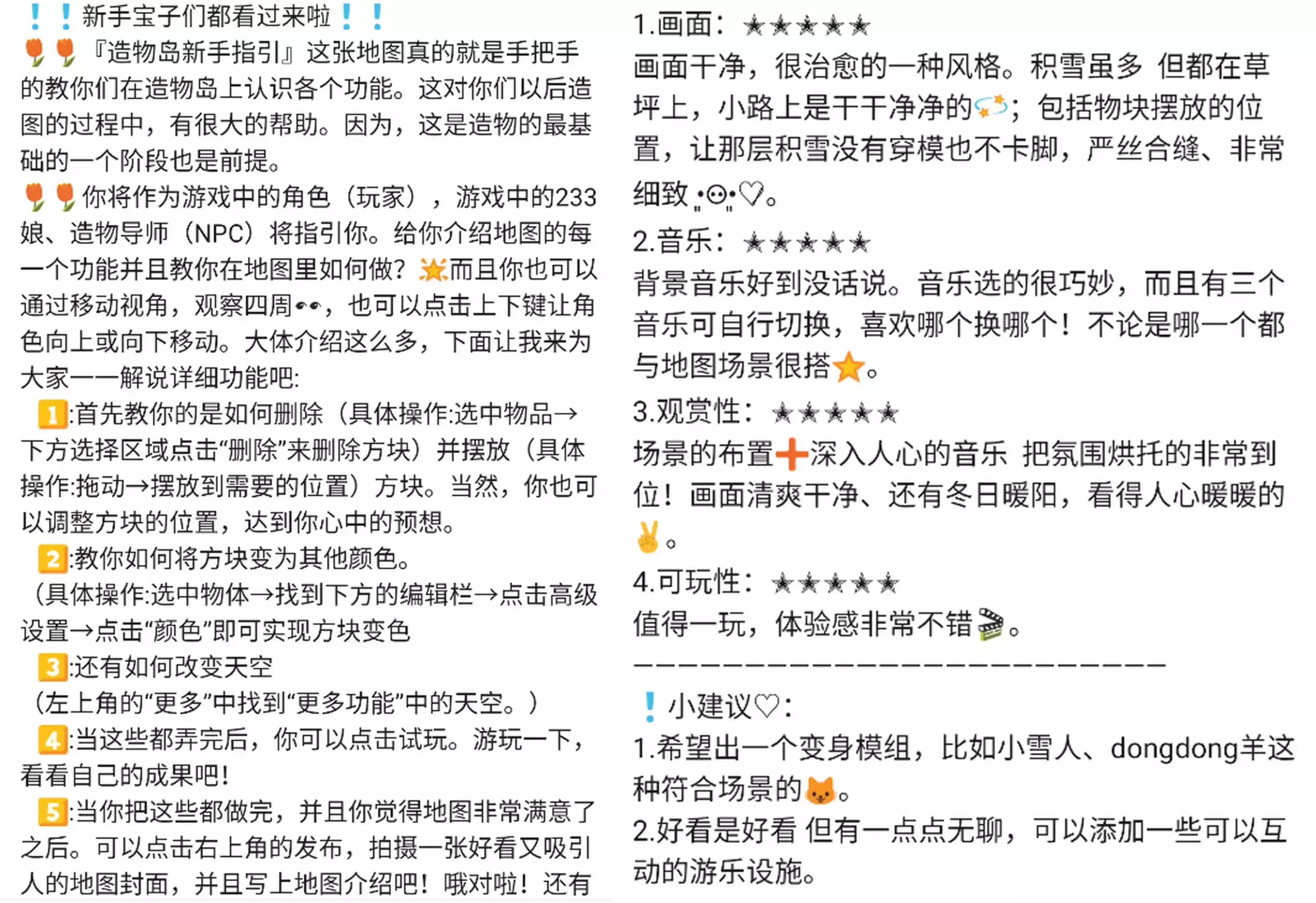 • 优质评价无需是对单个地图从头到脚全方位的评价
