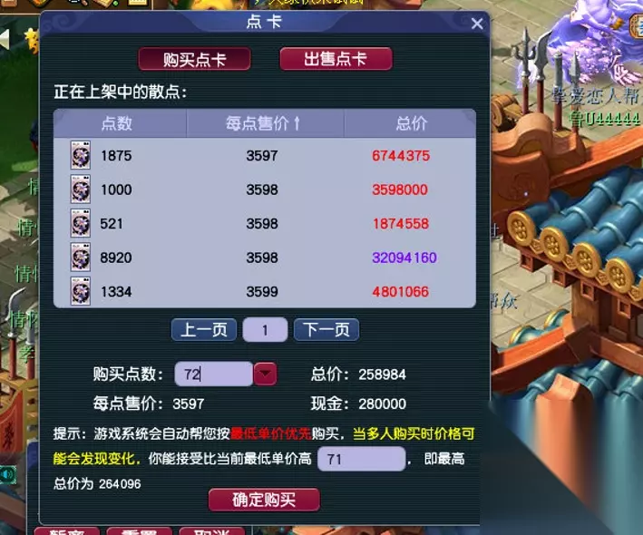 想来我还是摆的低了。 对比下那个商人给的1W,只能说那商人真的是黑。 再次劝导各位初次玩新区的小伙伴,新区处处是坑,商人,带练,一个比一个黑心。 不要轻易相信他们。 买卖物品,也都要多方比价,再做决定。 卖了些物资,换了些梦幻币后。我迅速去了秦府后院,抓紧时间换购点卡。 岁岁长安今天点卡比例又掉了100,现在是3600/点。