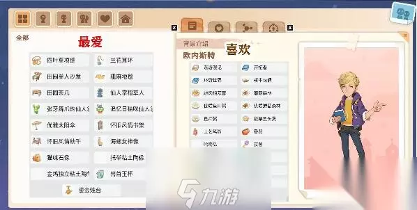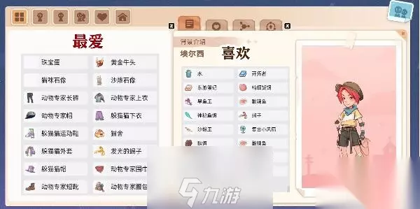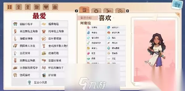 沙石镇时光人物喜好汇总 1、【阿蜜拉】。 最爱:【田园小柜子、租麻地毯、单边舞黏士陶像、托华黏土陶像、海螺女神像、四叶草项链、田园单人沙发、、金鸡独立粘士陶作兰花耳环、优雅花箱、跳舞黏土陶像、田园长餐桌、沙漠探险家帽子、怀旧风情秋千、悠闲藤椅、护目镜】