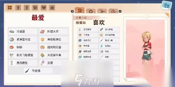 3、【格蕾丝】。 最爱:【冷凝器、料理大师、紧凑型马达、高级能源石、锏锅、鸡肉炖苁蓉、航天飞船模型、大花犀牛角、基因模型、苁蓉、平底锅】