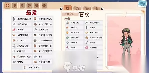 2、【米安】。 最爱:【沙漠探险家长靴、沙漠探险家长裤、铁质多用斧、矿井救援队上衣、铛钢锭、铁质多用榔、多功能办公桌、沙漠探险家围巾、佼佼小面、沙漠探险冢背心、躲猫猫运动鞋、矿井救援队下装、机能方桌、矿井救援队帽子、矿井救援队靴子、铜架、沙漠探险家帽子、怀旧风情书架】