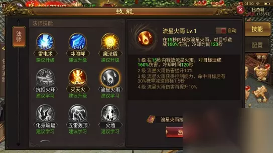 (4)流星雨: 1.技能效果:15秒内释放流星雨,对目标造成160%伤害,冷却时间120秒。除了增加伤害之外,升级技能还可以起到减速效果。 2.使用建议:法师的技能可以完美衔接,火墙的技能冷却时间短,有机会始终保持大面积的火焰。抵挡火环将敌人推入火墙内减速,然后使用流星雨继续攻击。