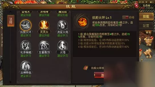 (2)抵抗火环: 1.技能效果:将自己周围的目标推开4格远,造成70%的伤害,冷却时间7秒。技能升级后可以减缓敌人的速度并提高自己的速度。该技能可以与火墙结合使用。 2.使用建议:怪物生成讲究的是效率。抵抗火环可以将范围外的怪物推入火墙内,减速效果可以间接增加伤害。