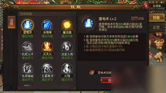 (3)雷电: 1.技能效果:使用雷电时,有20%的概率分裂出3道闪电攻击当前目标周围3格内的随机单位。技能升级后可以增加分解次数,算是基础伤害比较高的群体攻击。 2.使用建议:由于该技能比较容易升级,所以伤害还是很明显的,可以进一步增加群体输出能力。