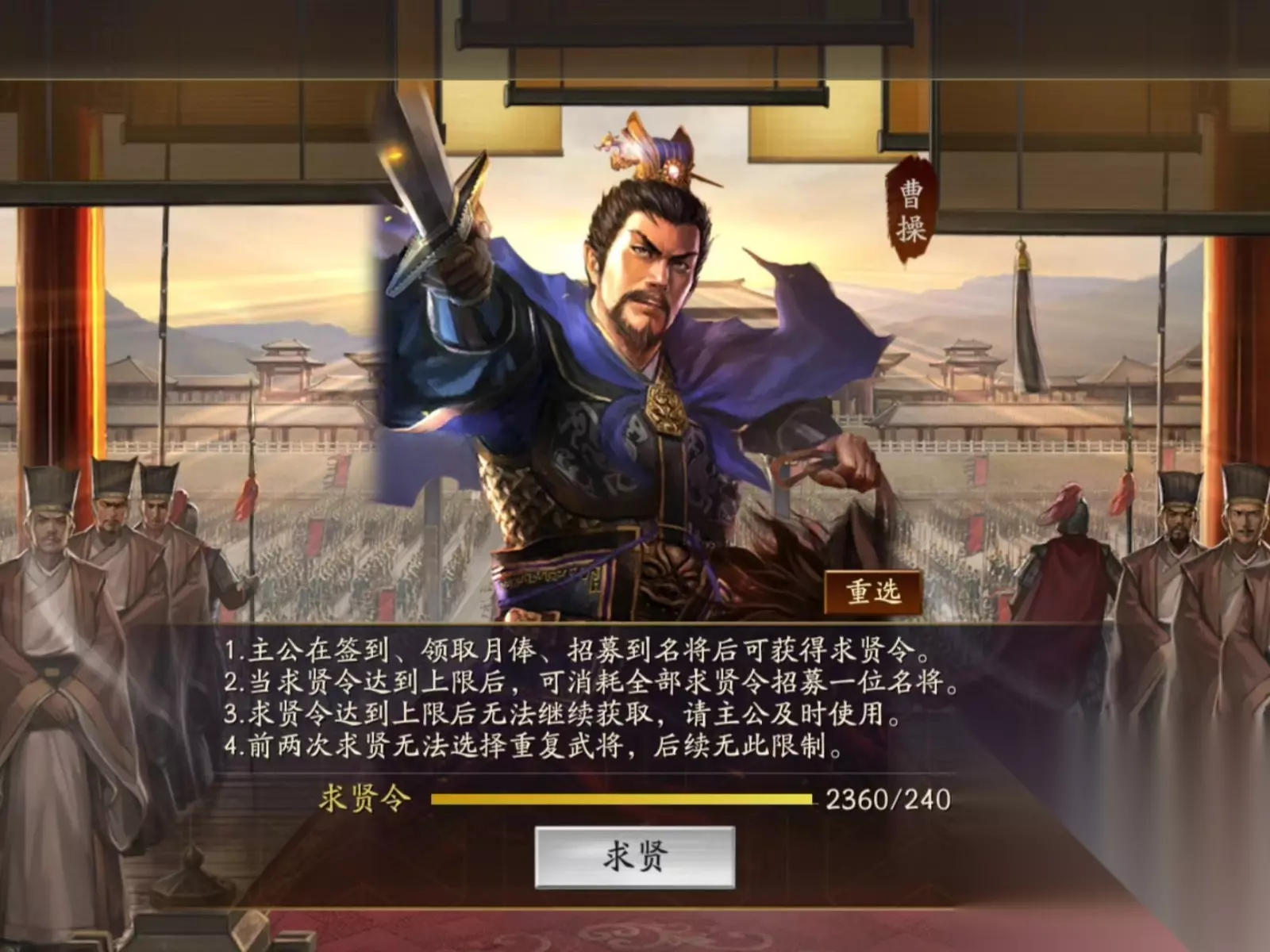 求贤令只能兑换当前及过往赛季的橙色武将,典藏武将是无法兑换的。而且同一武将只能用求贤令兑换一次,所以选的时候要格外谨慎。另外求贤令有存储上限,大概2000个左右,达到上限后就无法再获取新的。总的来说,求贤令是长期提升阵容实力的关键资源。合理规划积累和使用,才能让它发挥最大价值。