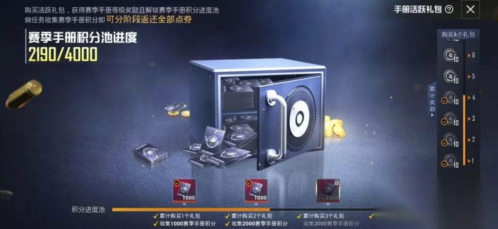 与以往不同的是,S12赛季之前的赛季手册物资全部返厂,玩家在购买精英手册满级后,可以用多余的赛季手册积分兑换返场皮肤。 活跃礼包变成了玩家们的不二选择。活跃礼包,类似于现实生活中的抵押贷款,就是说,您先花一千点劵购买一个活跃礼包,会获得1000赛季手册积分,解锁10级左右的手册等级,在这之后,您获得的所有积分都会用于“还贷”,等到您获得了1000积分后,会将你消费的1000点劵归还,还是十分划算的。我自己也是买了四个礼包,上图可以看见我已经还完两个。