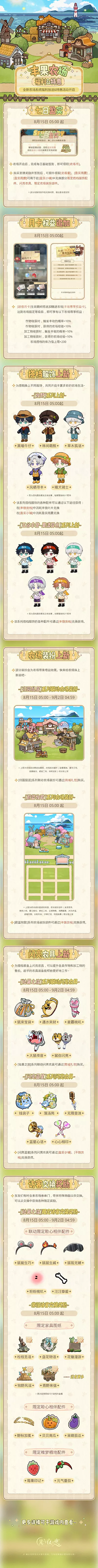 玩法上线时间:8月15日 05:00后开启,工作室[历程]达到[绳床瓦灶Ⅱ级]后,可通过主界面-[工作室]-[丰果农场]进入该玩法。