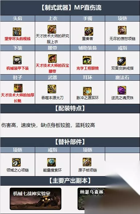 2.MP直伤流 【武器推荐】:吞噬本源太刀 【防具推荐】:望穿尽头的视线+天才上衣+机械下装+天才腰带+天才鞋子 【首饰推荐】:重奏者+愤怒项链+双音戒指 【特殊装备】:光学眼镜+脉冲耳环+逆流灵珠 【配装特点】:伤害高,速度快,缺点身板较脆,蓝耗较高