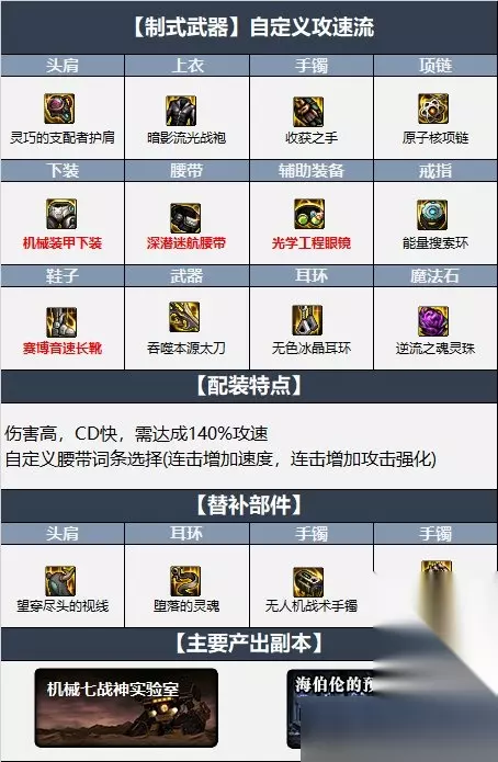 3.自定义攻速流 【武器推荐】:吞噬本源太刀 【防具推荐】:灵巧支配者+暗影流光上衣+机械下装+深潜腰带+赛博鞋子 【首饰推荐】:收获之手+原子项链+能量搜索环 【特殊装备】:光学眼镜+冰晶耳环+逆流灵珠 【配装特点】:伤害高,CD快,需达成140%攻速,自定义腰带词条选择(连击增加速度,连击增加攻击强化)