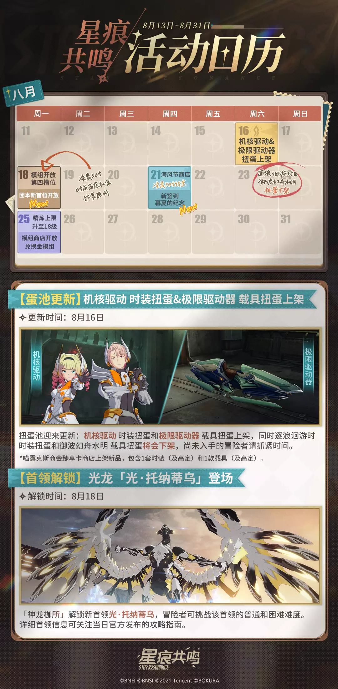 扭蛋池迎来更新,机甲风格的机核驱动时装扭蛋和极限驱动器载具扭蛋即将上架,而现有的逐浪洄游时时装扭蛋和御波幻舟水明载具扭蛋仅剩3天时间,还没入手的冒险者要赶快啦!