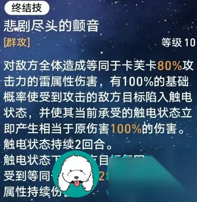 对敌方三个目标造成雷元素伤害,引爆指定中间目标身上的所有持续伤害。 6、终结技:悲剧尽头的颤音