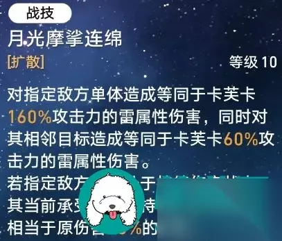 没啥好说的。可以不升级,主要靠战技打输出。 5、战技:月光摩挲连绵