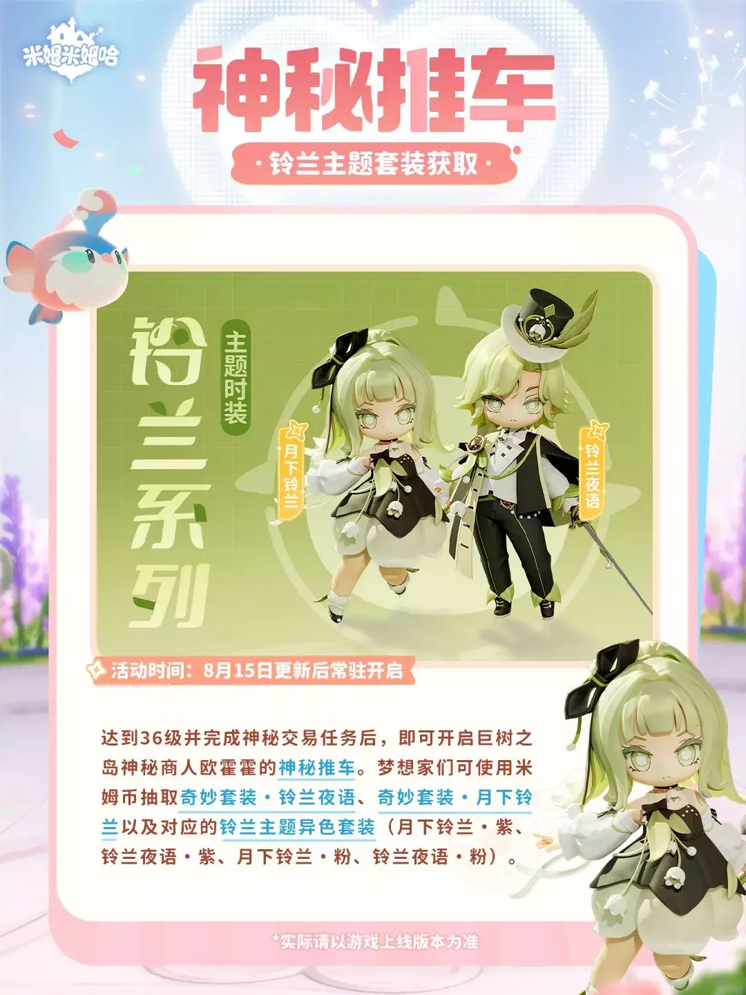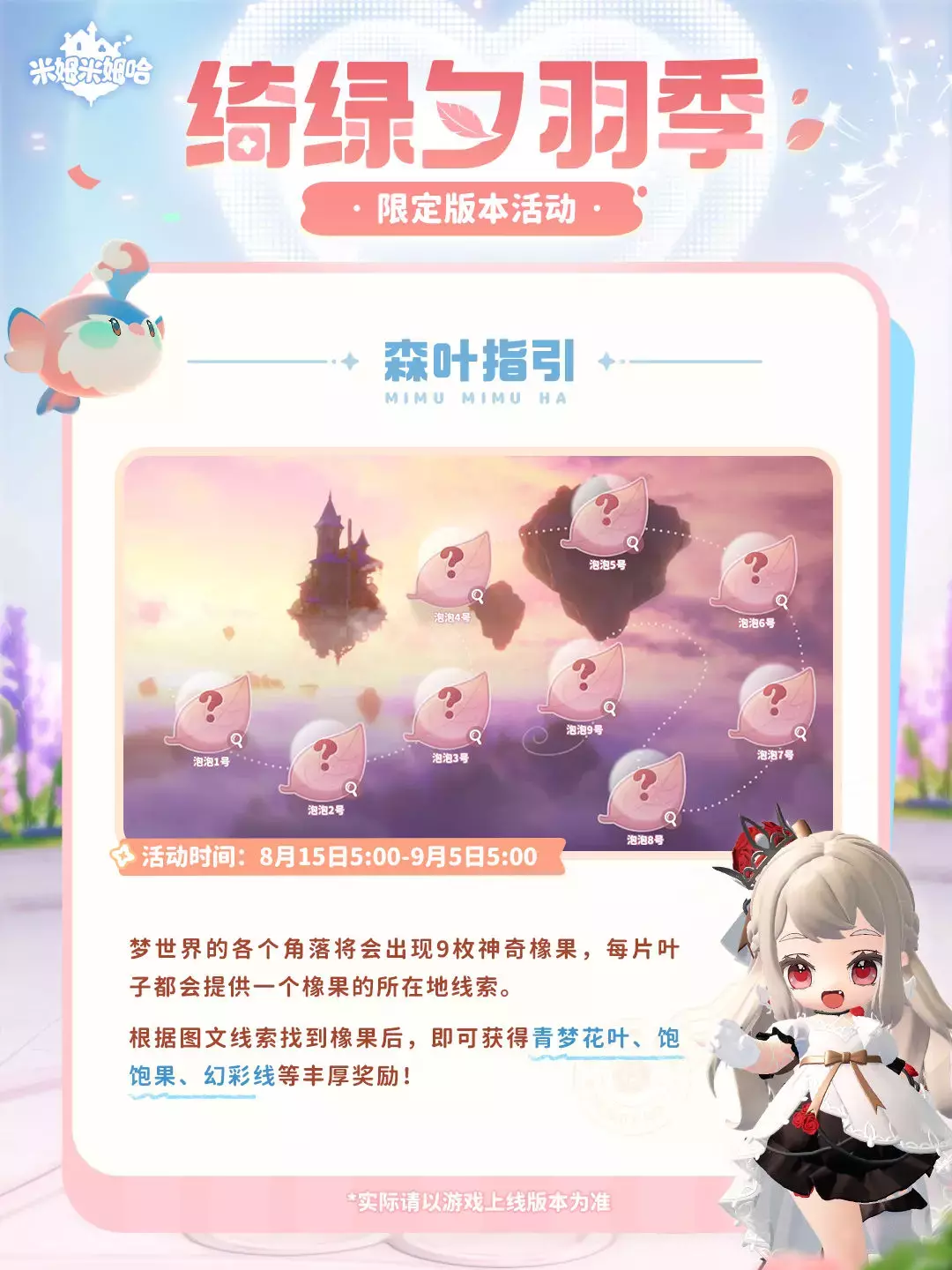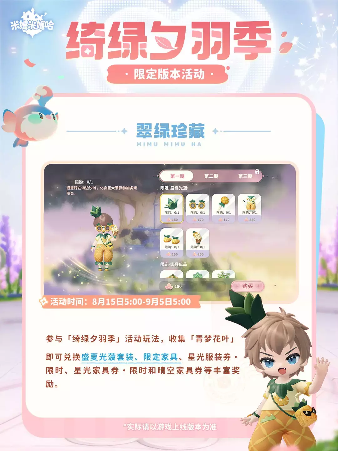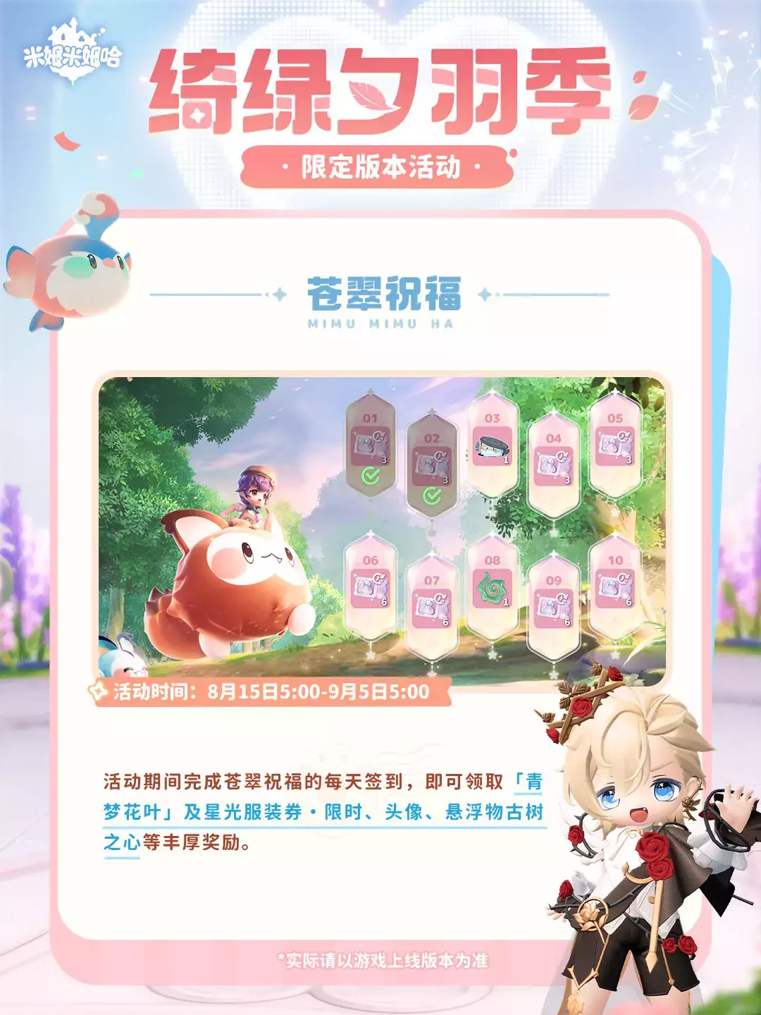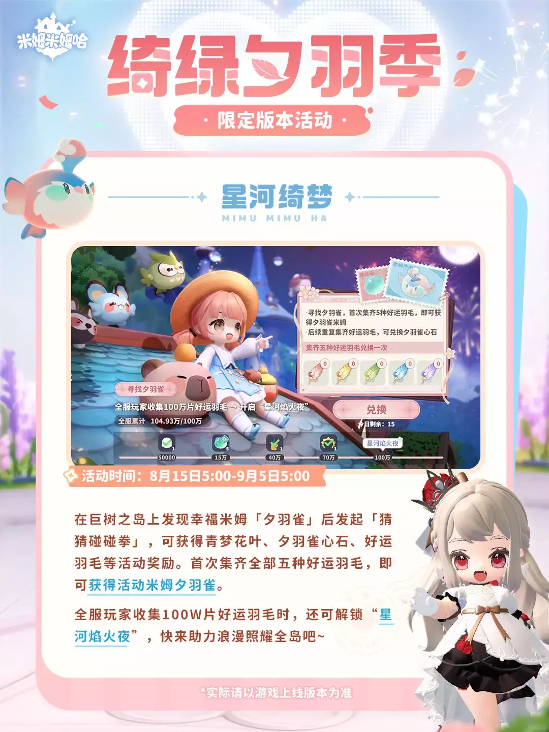 「绮绿夕羽季」将于8月15日(明天)更新后开启,参与活动可兑换七夕限定米姆「夕羽雀」!