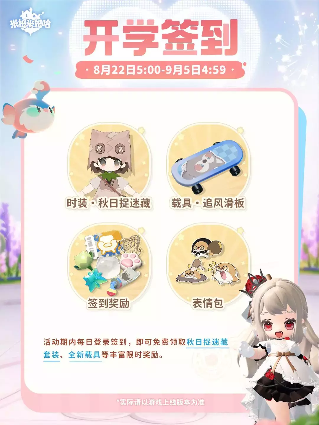 完成开学签到可领取限定时装、载具·追风滑板及全新聊天表情包,还有更多游戏奖励等你来领~