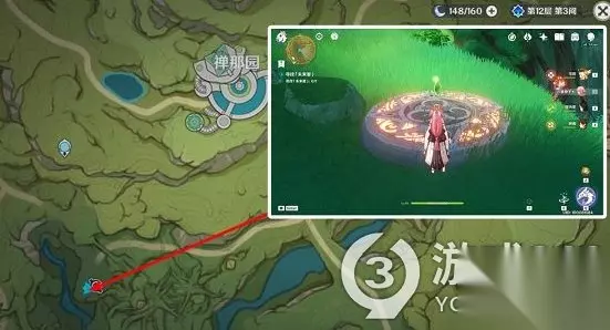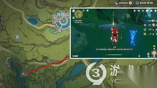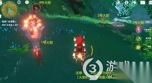 火元素的作用是点亮,火炬机关雷元素的作用是活化三场种子,草元素角色的作用是种子在被火元素烧焦之后将种子进行恢复。玩家可以用雷元素的角色活化火炬旁的种子,让隐形的火炬显现出来。当火炬任务点亮之后,地上就可以看到隐藏的石板,接着就可以找到第4颗未来星并拿到奖励。 在找未来星的时候,有一个最近路线,走到图中所指的位置,然后向左看就可以看到第4颗未来星,只要我们过去就可以拿到,而下面有隐藏的石板,所以不会掉落下去,可以放心拿未来星。