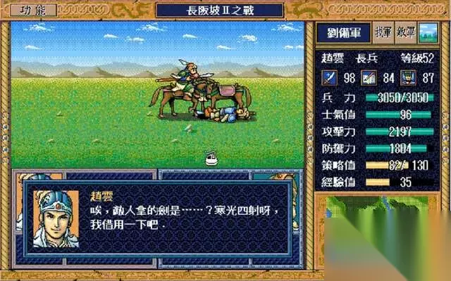 言归正传,青釭剑可以增加20%的武将攻击力,但想要拿到它可不是那么容易,需要赵云单挑夏侯恩才能获得,说青釭剑是《三国志英杰传》中最难获得的武器也不为过。本关分为上下两个小关,第一小关最多可以打七十回合,虽然夏侯恩在第一小关也会出现,但并没有赵云单挑他的剧情,必须等到第二小关才会触发两人的单挑。