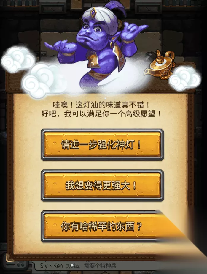 2、神灯的愿望有四种,其中只有物品类的魔毯是我们需求的,最多许愿物品两次可确保得到魔毯