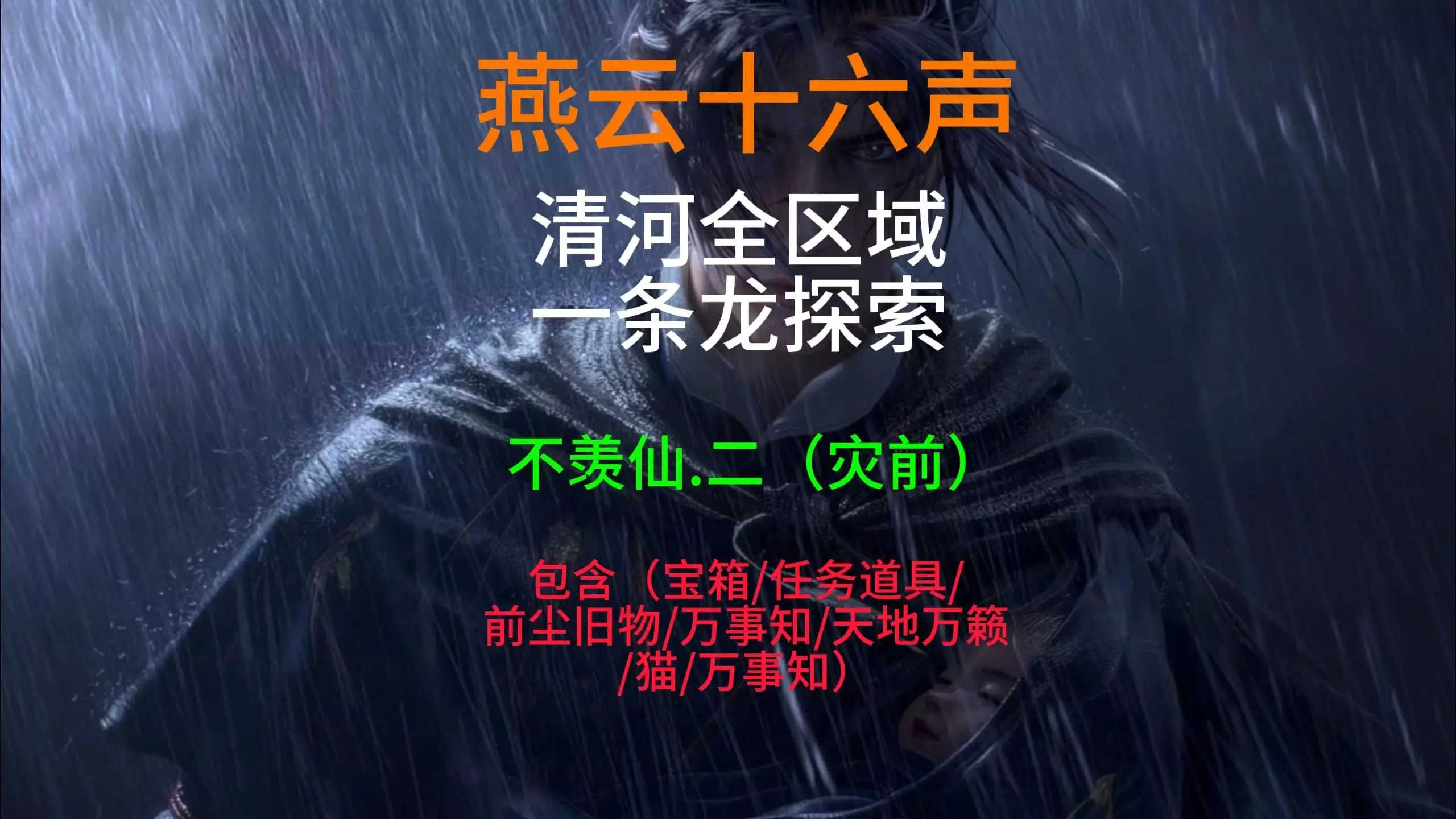 燕云十六声一条龙全收集【不羡仙.二(灾前)】内容包含宝箱/万事知/江湖故人/蹊跷/猫戏/见闻/前尘/博物/