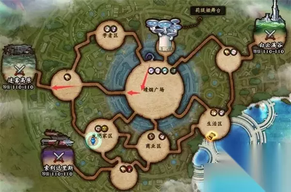 4、玩家可以在赛利亚房间中,通过右侧传送区域选定晴烟广场进行传送。 5、传送完成后,玩家可以打开游戏地图,便能直观看到迷雾高原。在晴烟广场一路朝左直行即可抵达。