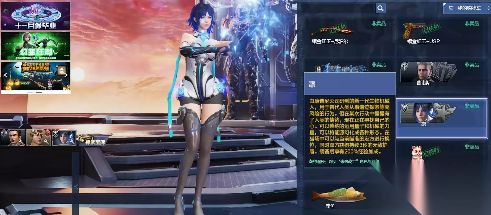 当前“未来战士”角色包共包含三位可操作特战员:曦(突击先锋)、凛(战术仿生体)、普诺斯(量子特战员)。曦具备短距瞬移与范围压制能力;凛为纯机械构造,支持无冷却模块化形态切换及纳米级自我修复;普诺斯则采用半机械半人类架构,在PVP对抗与PVE协作场景中均展现出均衡性能表现。