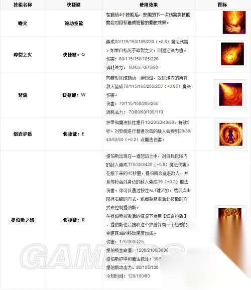 英雄属性 生命值:348 (+76 / 每级)、(1716 / 每18级) 魔法值:250 (+50 / 每级)、(1150 / 每18级) 移动速度:335 攻击速度:0.575(+1.25% / 每等级) 护甲值:8.5 (+4 / 每级)、(80.5 / 每18级) 魔法抗性:30 (+0 / 每级) 攻击距离:625 生命回复:4.5 (+0.55 / 每级) 魔法回复:6.9 (+0.60 / 每级) 使用技巧 自己使用 安妮的终极必杀技和晕眩技能一起使用能够扭转局势。 使用碎裂之火技能杀死小兵,可以让安妮在游戏早期打到很多钱。 熔岩护盾能够有效地帮助安妮叠加嗜火技能所带来的晕眩,有时尽早升1级该技能是合算的。[4] 敌人使用 安妮召唤的巨熊提伯斯能烧伤他附近的敌方单位。切记远离被召唤出的提伯斯。 召唤师技能惩戒也能够对提伯斯造成伤害。 留意安妮身上白色的漩涡能量,这意味着她已经准备好施放眩晕。