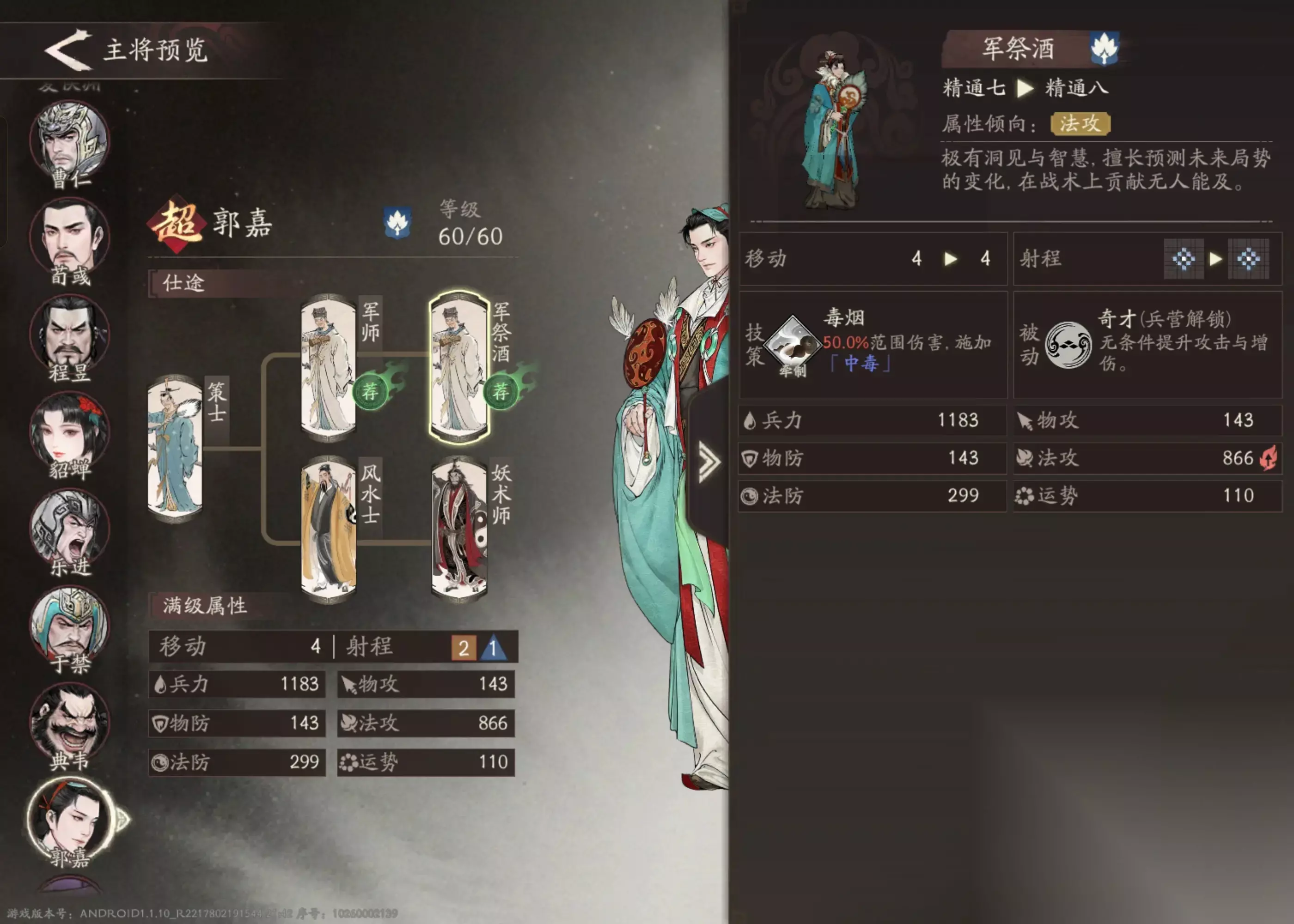 一、核心机制:距离即是力量 郭嘉所有战术价值的根基,都建立在他独特的天赋之上:他与目标之间的距离越远,其技能的伤害和效果就越强。这一机制决定了他的基本作战原则,即始终占据战场的最远端进行输出。 为了将这一核心机制最大化,兵种路线的选择变得毫无悬念。必须选择射程更远的军祭酒分支,这并非一个可选项,而是解锁其全部潜能的必要步骤。这一选择能让他获得堪比远程射手的攻击范围,从而保证天赋效果的稳定触发。