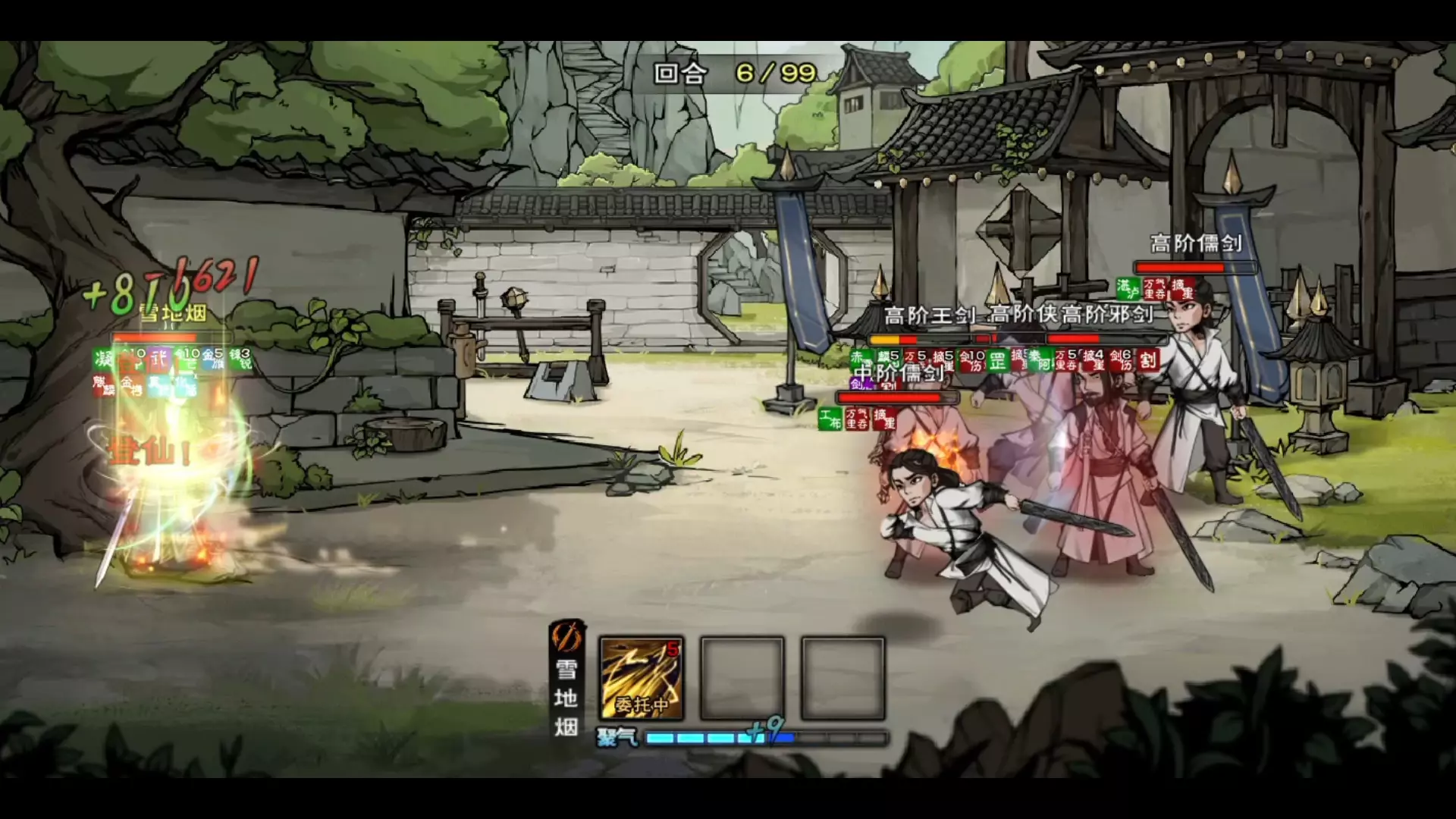 这是武侠手游《烟雨江湖》的游戏内容展示,玩家携带习得夺天地造化功的角色,在屋山开启七重剑阵挑战,与多阶剑类敌人展开回合制对战,呈现了战斗过程与武学界面。