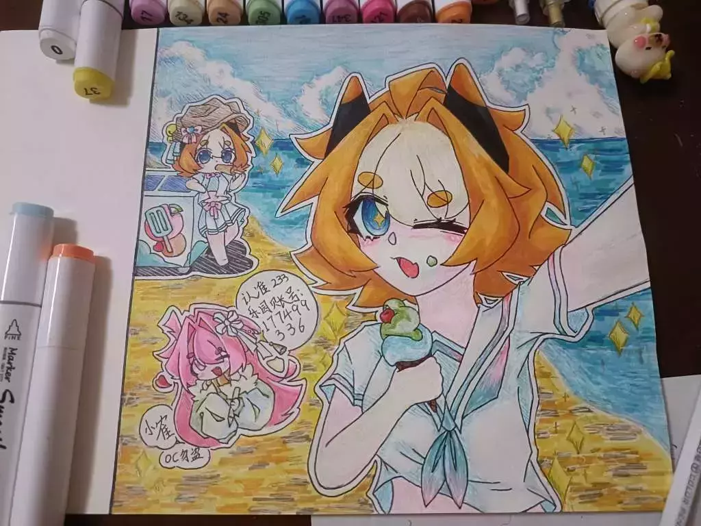 绘画的笔:铅笔、0.5mm的圆珠笔、酒精马克笔(没墨了)、彩铅、金与白色的高光笔、10色圆珠笔