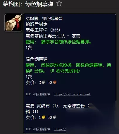 大家好,我是编辑。 P2开启后会解锁大量工程眼镜,所以工程也是升级装备的好方法。这是所有工程蓝图的掉落物和来源的列表。建议点赞并保存。 [结构图:绿色烟幕弹] 拾取时绑定 所需工程(335) 需要塞纳里奥远征队- 友好 [绿色烟幕弹] 使用:向指定位置投掷一枚绿色烟雾弹,持续5分钟。 需要元素炸药粉、灵纹布、绿色染料 - 赞加沼泽塞纳里奥远征军军需官初始购买 - 塞纳里奥远征队(友方)
