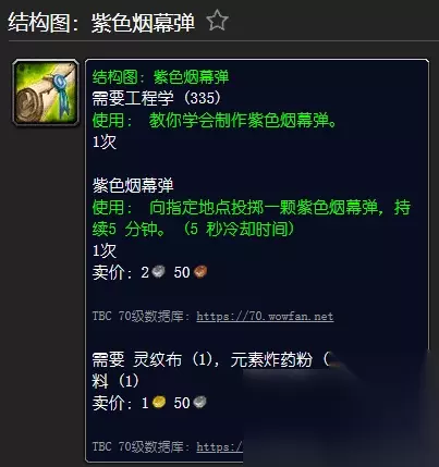 [结构图:紫色烟幕弹] 所需工程(335) [紫色烟幕弹] 使用:向指定位置投掷一枚紫色烟雾弹,持续5分钟。 需要元素炸药粉、灵纹布、紫色染料
