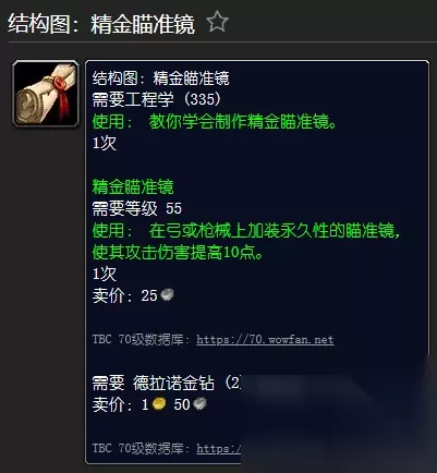 [结构图:精金瞄准镜] - 在影月谷由Daggle Ironshaper Gun and Ammo Dealer(联盟)和地狱火半岛由Mihi Faso Gunsmith(部落)出售 所需工程(335) [精金瞄准镜] 需要等级55 使用: 在弓或枪上安装一个永久瞄准镜,使其攻击力提高10 点。 需要瑟银管, 精金锭(8), 金色德莱尼钻石(2)