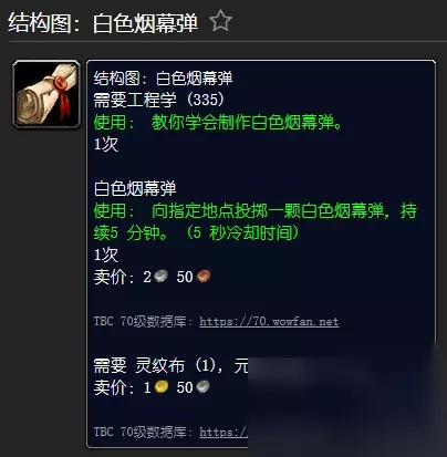 [结构图:白色烟幕弹] - 由沙塔斯城贫民窟的星界商人拉斯莱出售 所需工程(335) [白色烟幕弹] 使用:向指定地点投掷一枚白色烟雾弹,持续5分钟。 需要元素炸药粉, 灵纹布