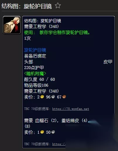 [结构图:旋轮护目镜] - 由地狱火半岛的NPC 出售 需要工程(340) [旋轮护目镜] 装备头部皮甲时绑定 220 护甲 随机附魔 耐久性60/60 需要工程(340) 需要重结皮(4), 血石榴石(2), 奥术之尘(8)