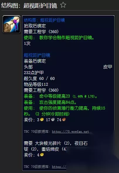 [结构图: 超视距护目镜] - 莫格武器匠67恶魔(影月谷)掉落率0.9% 拾取时绑定 所需工程(360) [超视距护目镜] 装备头部皮甲时绑定 232 铠甲 耐久性60/60 所需工程(360) 装备: 命中等级提高23 点。 装备:攻击力增加84点。 使用: 提高你的潜行探测能力,持续15 秒。 需要重结皮(4), 氪锭(2), 夜之眼(2), 大块棱柱碎片(2)