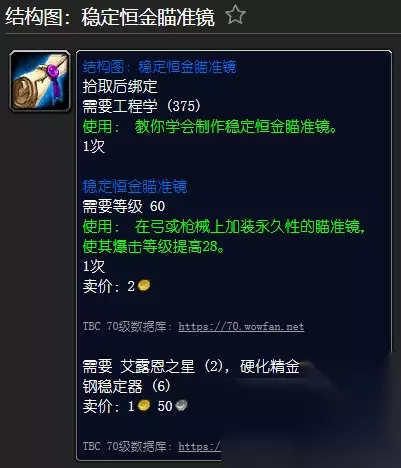 [结构图:稳定恒金瞄准镜] - 猎人阿图门(卡拉赞)有5% 掉落率 拾取时绑定 需要工程(375) [稳定恒金瞄准镜] 需要等级60 使用: 在弓或枪上安装一个永久瞄准镜,使其致命一击等级提高28 点。 需要硬化精金管(2), 魔钢稳定器(6), 艾露恩之星(2)