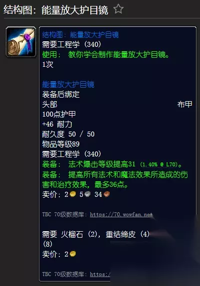 [结构图:能量放大护目镜] 需要工程(340) [能量放大护目镜] 装备头部布甲时绑定 100 护甲 +46 耐力 耐久性50/50 需要工程(340) 装备: 法术致命一击等级提高31 点。 装备:增加所有法术和魔法效果的伤害和治疗效果最多36点。 需要重结皮(4), 火珠石(2), 奥术之尘(8)