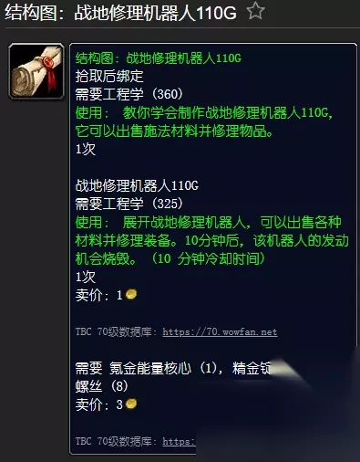 [结构图:战地修理机器人110G]- 2.3 版补充 - 由甘纳格分析师在刀锋山掉落,掉落率为1.43% 所需工程(360) [战地修理机器人110G] 所需工程(325) 使用:部署一个现场修理机器人来销售材料和修理物品。 10分钟后就坏了。 5次 需要精金锭(8)、魔铁螺栓(8)、氪石能量核心
