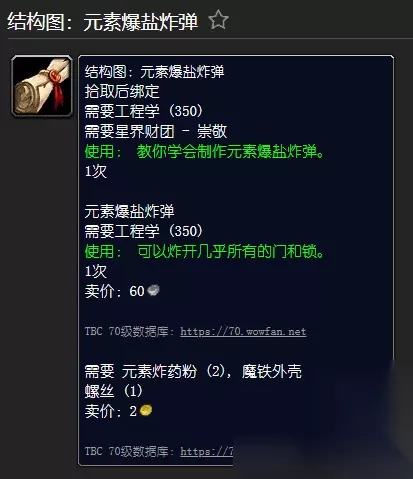 [结构图:元素爆盐炸弹] 拾取时绑定 需要工程(350) 需要星界联盟- 崇敬 使用: 教你学会制作元素盐炸弹。 [元素爆盐炸弹] 需要工程(350) 使用:炸毁几乎所有的门和锁。 需要元素炸药粉(2), 魔铁外壳, 魔铁螺丝 - 星界财团材料管理- 里维尔 - 可在纳格兰和虚空风暴星体财团补给品中找到