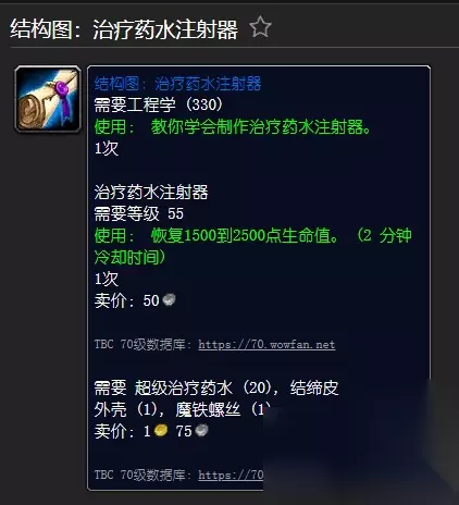 [结构图:治疗药水注射器] 需要工程(330) [治疗药水注射器] 需要工程(305) 使用:恢复1500 至2500 点生命值。 20次 需要魔铁外壳, 魔铁螺丝, 结节皮革(2), 超级治疗药水(20)