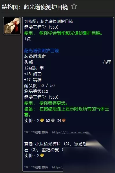 [结构图:超光谱侦测护目镜] - 由地狱火半岛的莱布斯基高级技师(联盟)和赞加沼泽(部落)出售 需要工程(350) [结构图:超光谱侦测护目镜] 装备头部布甲时绑定 124 铠甲 +48 耐力 +47 精神 耐久性50/50 需要工程(350) 装备:可以探测部分溶解到另一个维度的物体,例如虚空风暴区域的奥术漩涡。 使用:让你看得更远。 需要重结皮(4), 氪锭(2), 黑橄榄石(2), 小棱柱碎片(2)