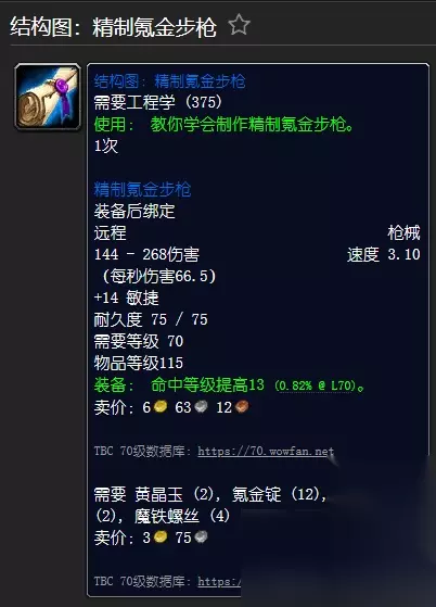 [结构图:精制氪金步枪] 需要工程(375) [精制氪金步枪] 装备时绑定 枪144 - 268 伤害速度3.10 (66.5 每秒伤害) +14 敏捷 耐久性75/75 需要等级70 装备: 命中等级提高13。 需要硬化精金管(2)、氪锭(12)、魔铁螺丝(4)、稀有黄玉(2)