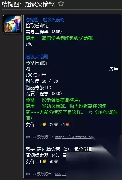 [结构图: 超级火箭靴] - 机械师搅拌BOSS(蒸汽洞)掉落率为8% 拾取时绑定 需要工程(355) [超级火箭靴] 装备后绑定脚部皮甲 196 铠甲 耐久性50/50 需要工程(330) 装备:攻击力增加80点。 使用: 激活火箭靴,大大提高你的速度……在大多数情况下。 (5分钟冷却时间) 需要重结皮(8), 氪石能量核心(2), 硬化精金管(2), 魔钢稳定器(4)