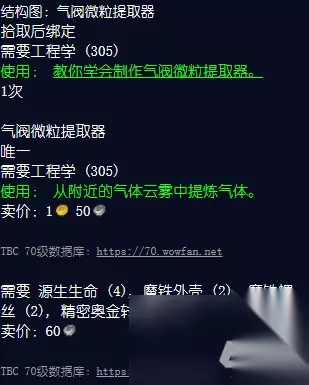 [结构图:气阀微粒提取器] 拾取时绑定 需要工程(305) [气阀微粒提取器] 需要工程(305) 使用: 教你学会制作阀门微尘提取器。 需要魔铁外壳(2)、魔铁螺丝(2)、原始生命(4)、精细奥金转换器 - 赞加沼泽联盟或部落各自阵营的NPC将接受任务:气阀粒子提取器!