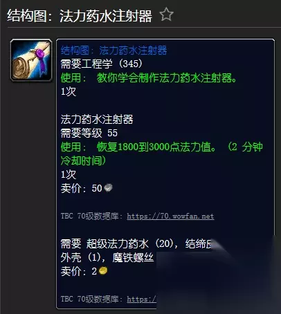 [结构图:法力药水注射器] 需要工程(345) [法力药水注射器] 需要等级55 需要工程(305) 使用:恢复1800 至3000 点法力。 20次 需要魔铁外壳, 魔铁螺丝, 结节皮革(2), 超级法力药水(20)