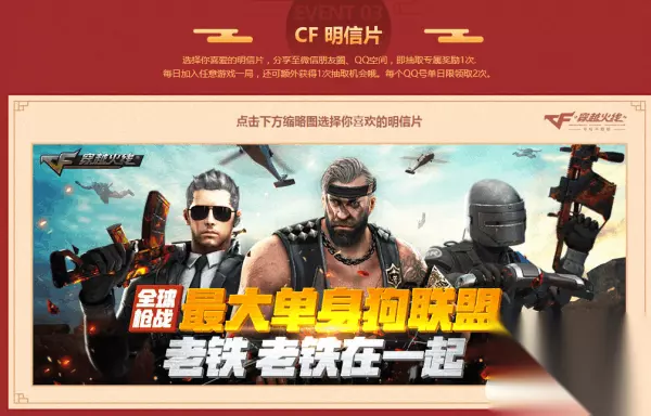 小编要带给大家的是CF3月神枪庆新年的活动。活动期间选择你喜爱的明信片,分享至微信朋友圈、QQ空间,即抽取专属奖励1次哦!那么接下来,就赶紧和小编一起来参与此次的活动吧!