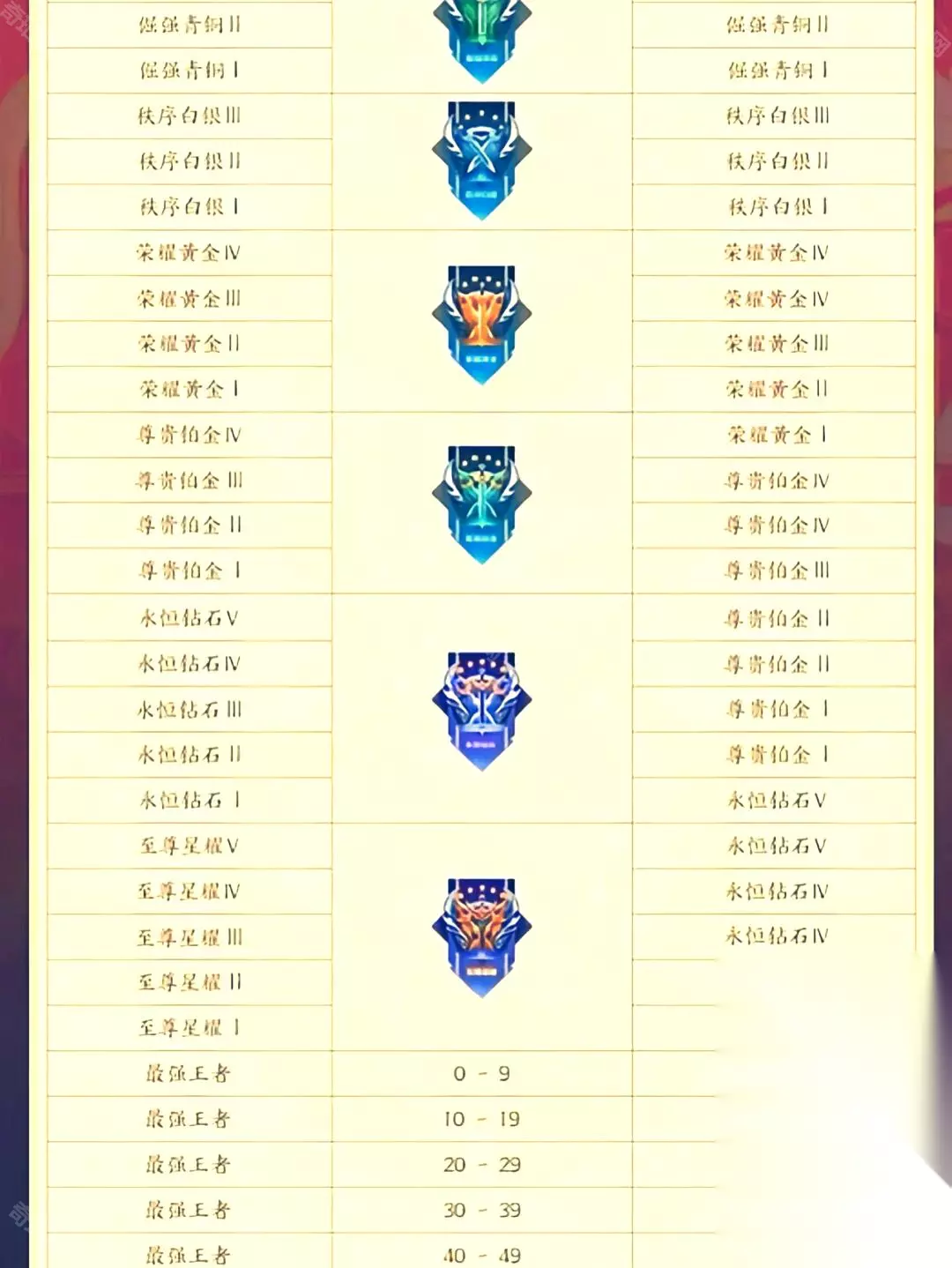 段位解析 倔强青铜一、 倔强青铜二、 倔强青铜三(每段位三颗星) 秩序白银一、秩序白银二、秩序白银三(每段位三颗星) 荣耀黄金一、荣耀黄金二、荣耀黄金三、荣耀黄金四(每段位四颗星) 尊贵铂金一、尊贵铂金二、尊贵铂金三、尊贵铂金四(每段位四颗星) 永恒钻石一、永恒钻石二、永恒钻石三、永恒钻石四、永恒钻石五(每段位五颗星) 至尊星耀一、至尊星耀二、至尊星耀三、至尊星耀四、至尊星耀五(每段位五颗星) 最强王者(0~24星) 无双王者(25~49星) 荣耀王者(50~99星) 传奇王者(大于等于100星)