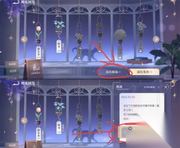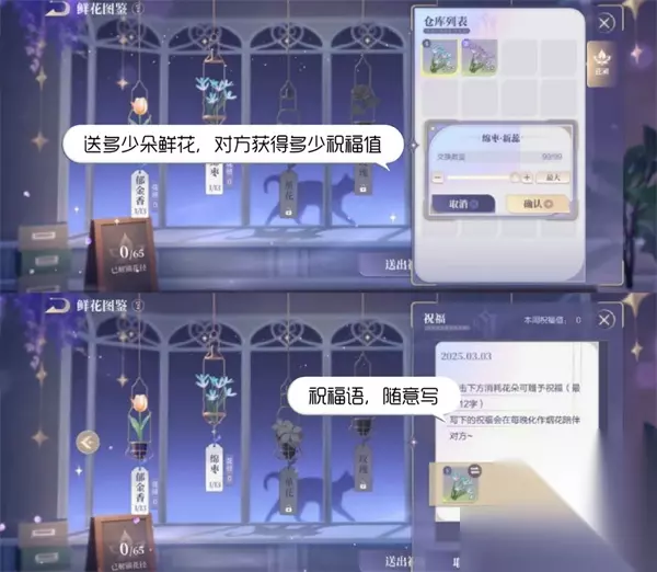 -下图所示,选择花朵数量,送多少朵花朵,对方获得多少祝福值。祝福语随意,一个字母/数字/符号就行。