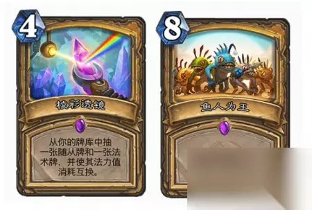 构筑核心:透镜+鱼人为王 很多小伙伴一开始和笔者一样会吐槽鱼人为王不如当年的亡者归来可控性高,但是我们不能否认一点,那就是这张卡的使用时机要比亡者归来早太多,不过7费7个鱼人说实话很容易被对手aoe清的死去活来,不好打出优势,于是我们想到减费策略,目前来看就是棱彩透镜这张卡了,将随从卡和法术卡费用互换,所以只要这张法术是鱼人为王,而随从是一张低费随从,那么换费以后这波7个小鱼人就非常强势,5费回合就能出场; (构筑调整警告:构筑上我们的随从费用都不选高费的,5费只有一只,4费只有2只,其余1-3费,保证了减费的成功率。而法术方面我们只选择了透镜和鱼人为王,就是为了减费成功,即便透镜波抽到自己,那第二波也能成功减费鱼人为王,这一点是大家修改构筑的时候要特别注意的!!!不能瞎加法术!!!)